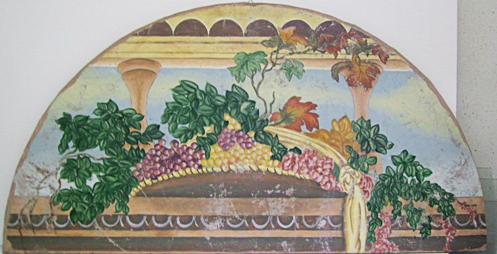 Affresco a strappo retoucheè con cesto di frutta con parte superiore stondata di autore anonimo.